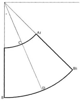 Проводим вертикальную линию и перпендикуляр к ней через точку О. ОА = ОА 1 = радиус = 1/2 обхвата талии /3,14/ (4/4). (Пример: 70 см/2/3,14/(4/4) = 11,15 см.) Дуга АА 1 = полуобхват талии. АВ = А1В1 = длина юбки (Ди ). (Пример: 50 см. Подробнее...
